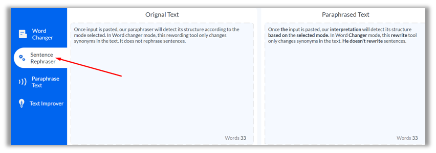 Word Changer:This mode allows you to change synonyms only. It will replace words with appropriate synonyms in the text.